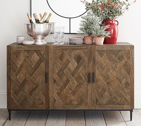 Artistic parquet flooring, made up of sections and/or tiles of wood patterns. That episode gave Pottery Barn, specifically the apothecary table from White Plains, the best story it could ever ask for. Pieces of reclaimed wood form a richly grained mosaic on this console table.